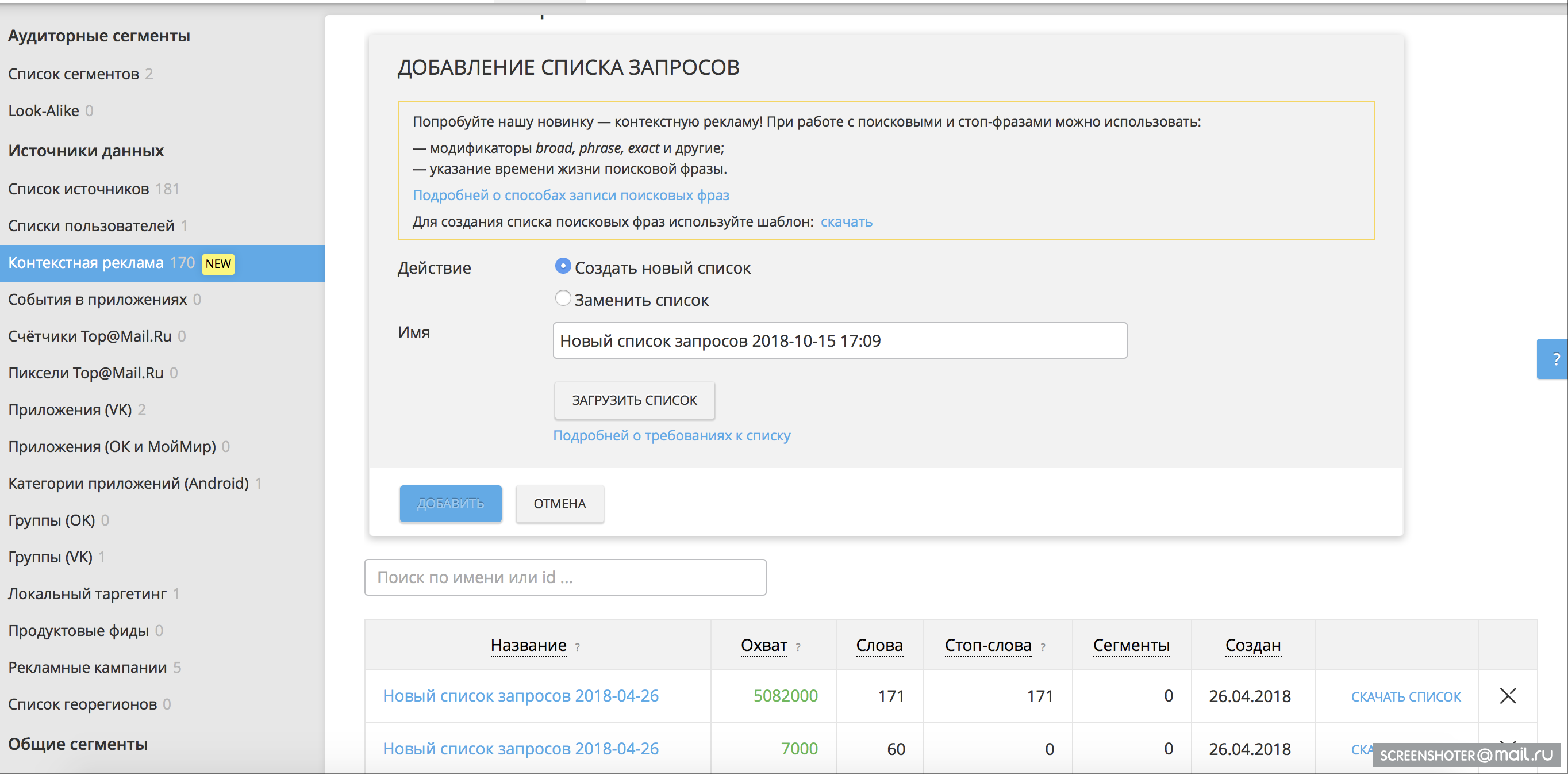 Раздел «Контекстная реклама». При загрузке списка ключевых слов под формой добавления появится таблица с охватом аудитории.