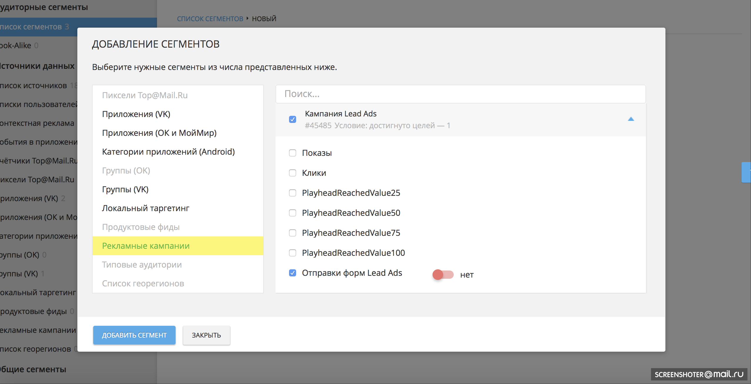 Сегмент на основе Lead Ads создается в разделе «Аудитории». В качестве источника необходимо выбрать «Рекламные кампании», в которых использовался формат Lead Ads.