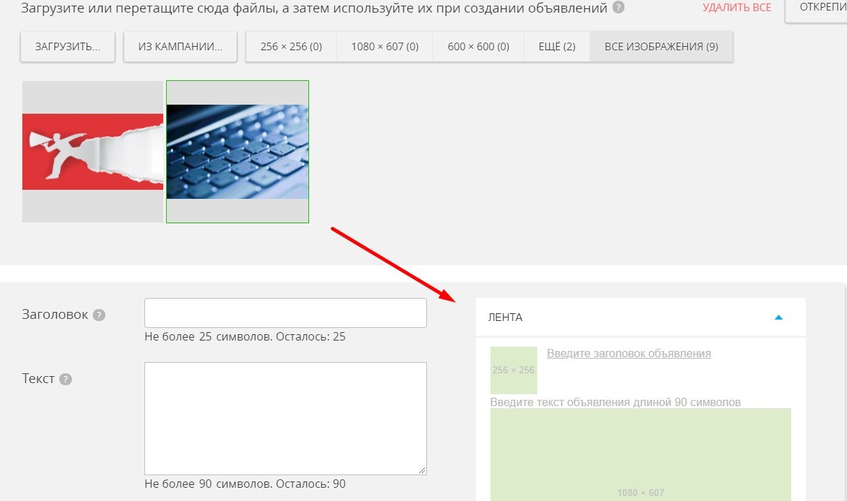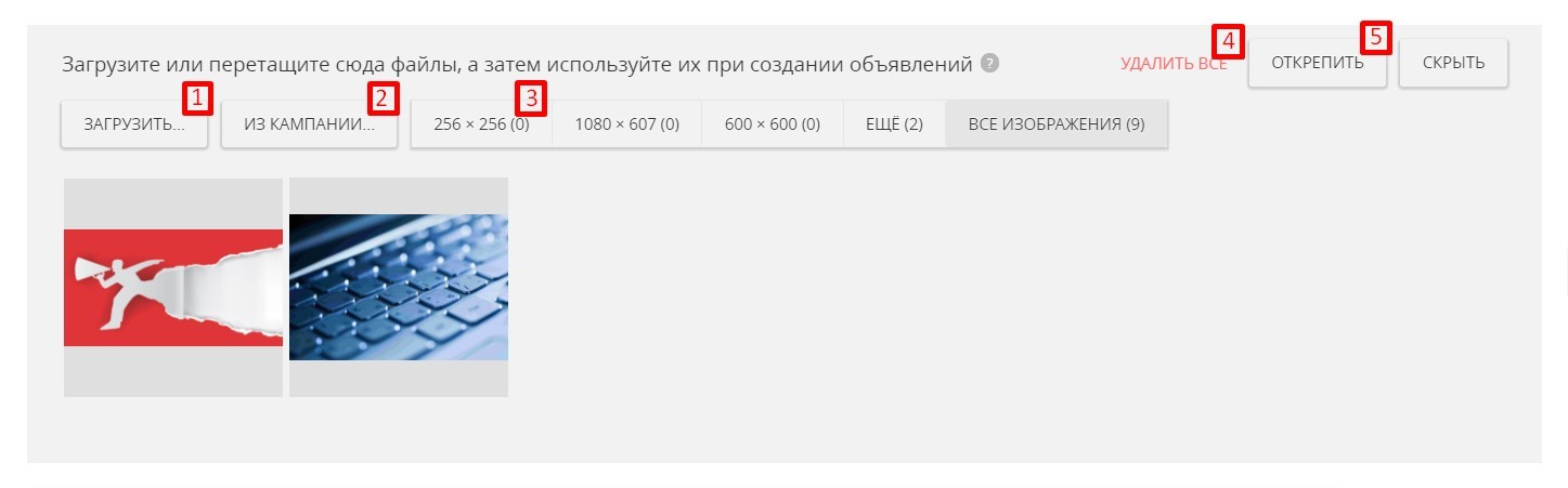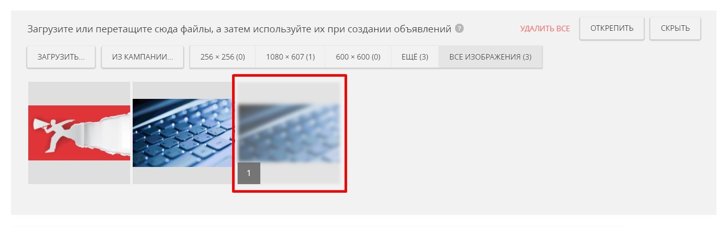 Креативы группируются по размеру загруженных материалов. К примеру, при настройке мультиформата можно сразу выделить изображения размера 256х256, 1080х607 и 600х600 из всех загруженных картинок (3).
