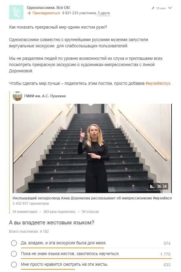 В проекте #Музейвслух приняли участие ГМИИ им. Пушкина, Русский музей, «Гараж», МОМА. Экскурсоводы музеев рассказывали о временных и постоянных экспозициях на жестовом языке, а трансляция в соцсети проходила с помощью приложения OK Live.