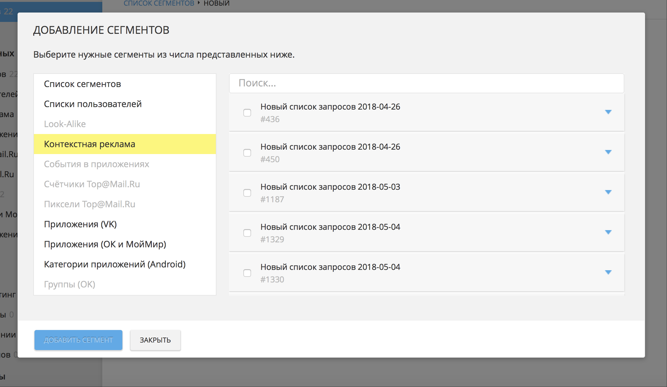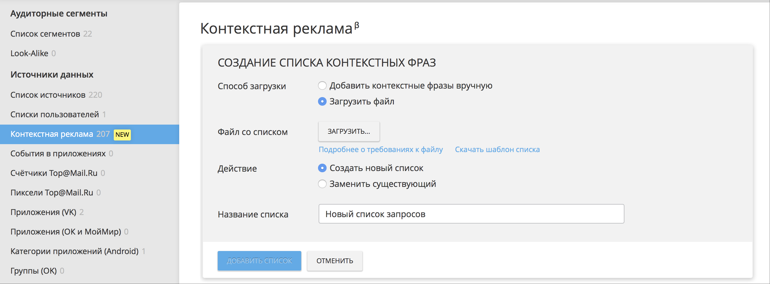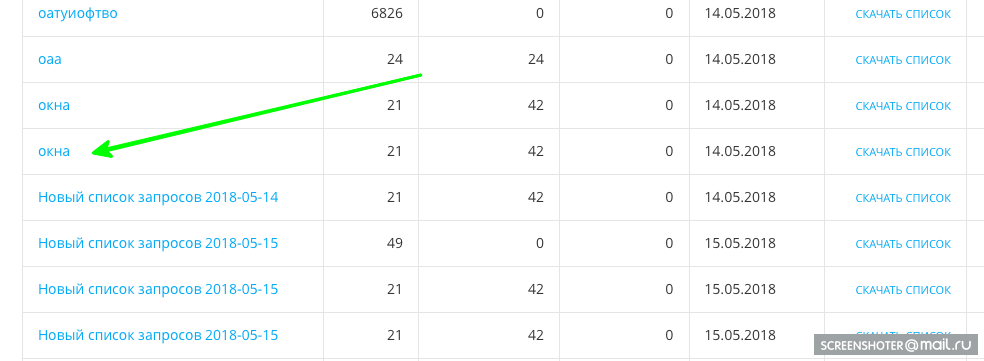 Важно над списком слов в файле .csv добавить заголовки колонок. После загрузки вам доступен список-таблица всех загруженных вами файлов. По наведению можно переименовать список для дальнейшего использования. Клик по названию списка открывает для просмотра и поиска перечень использованных фраз.
