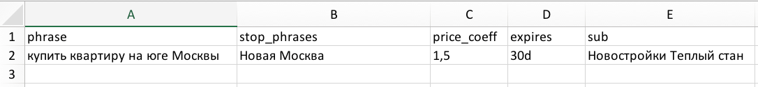 phrase,stop_phrases,price_coeff,expires,subВ первой строчке необходимо написать