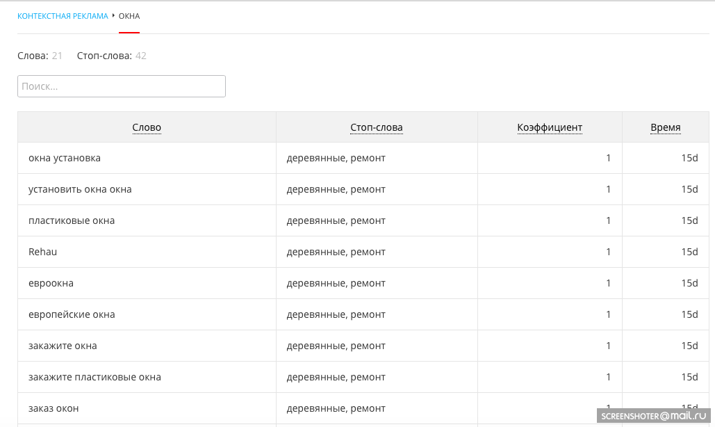 Коэффициент к ставке (price_coeff)Вы можете управлять ставкой по ключевым словам, анализируя их конверсионность. Если сработала какая-то фраза пользователя, то ставка кампании умножается на коэффициент, привязанный к этой фразе. Коэффициент должен быть больше 0 (по умолчанию он равен 1). Работает только в кампаниях с определенными аукционными стратегиями - Фиксированная ставка или Минимальный расход. Для остальных типов стратегий коэффициент будет поддерживаться позже.Временной промежуток (expires)Время, по истечении которого фраза из запроса перестанет учитываться: например, можно ограничить давность поиска одной неделей для товаров и услуг, которые пользуются быстрым спросом. Задается в удобном формате: 2d, 3h, 2d3h15m и т.п. Если буква не указана, то система рассчитывает значения в днях. Если вы оставляете окно пустым, выставляется период по умолчанию — 12 дней.